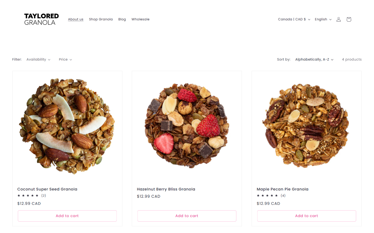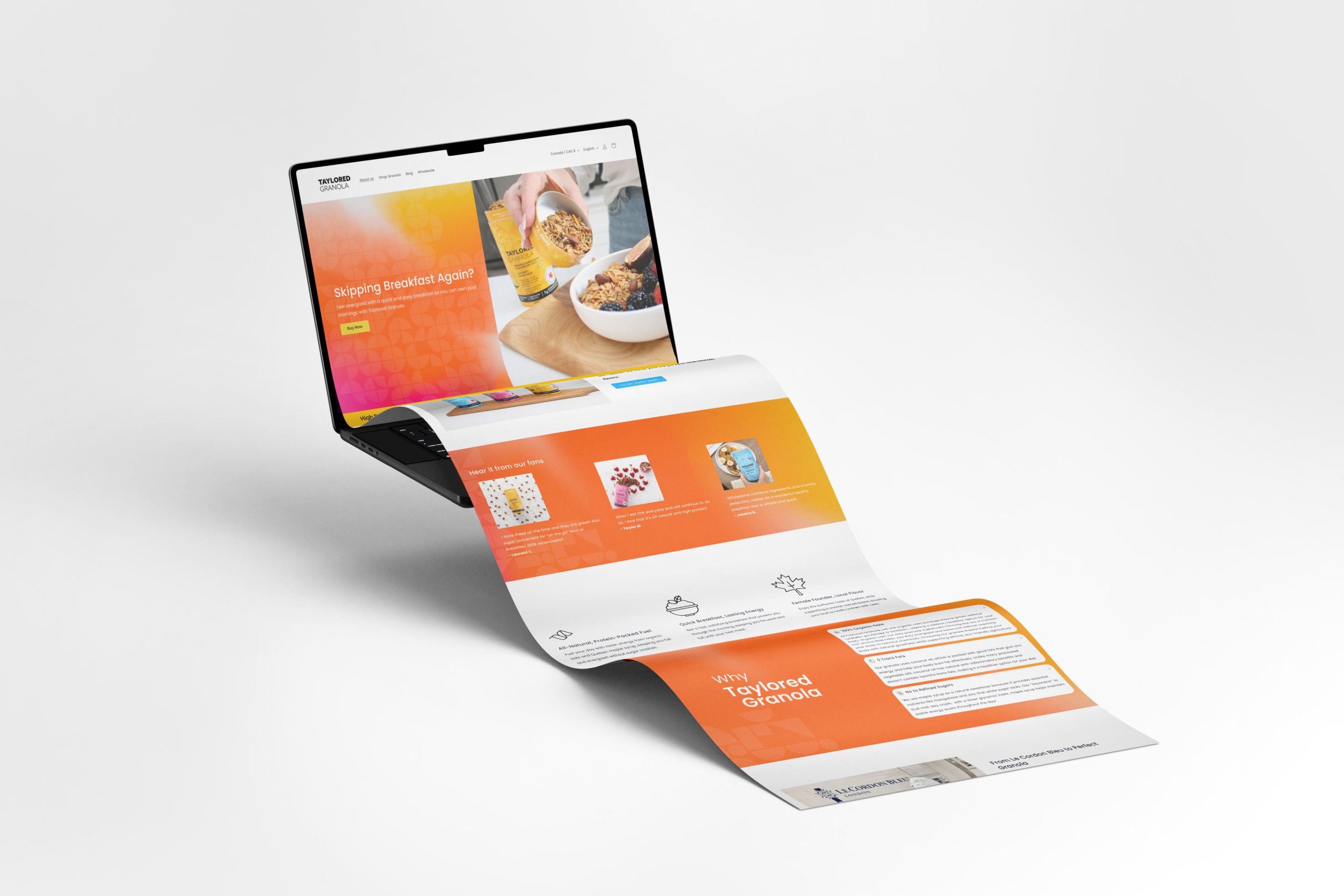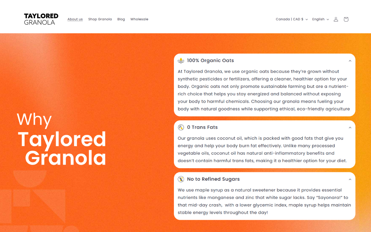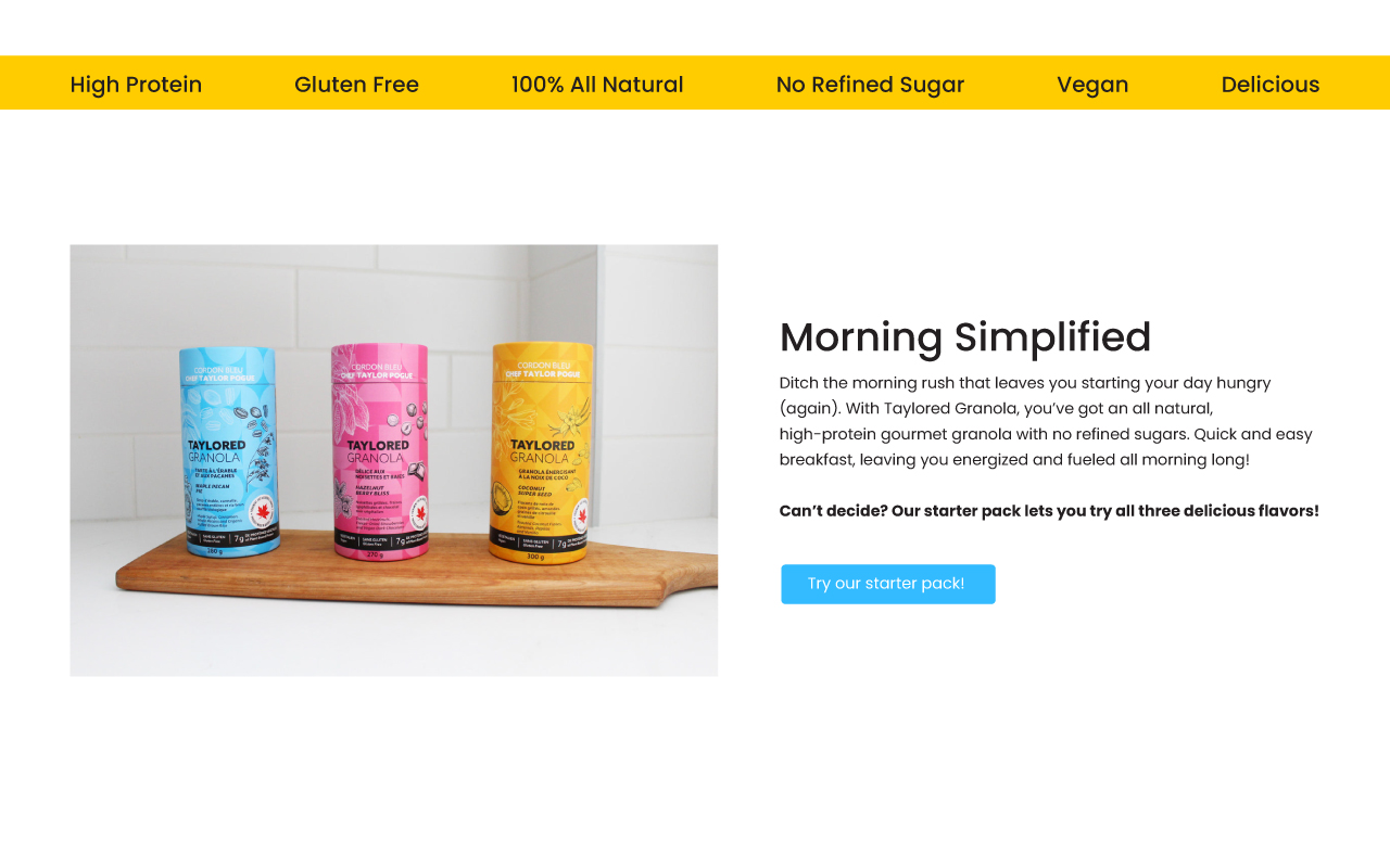 “Taylored Granola” is a premium granola brand based in Montreal that offers a variety of healthy and delicious granola blends, tailored to fit individual tastes and dietary preferences. The scope of this project was rebranding to reflect their commitment to quality and personalization, as well as designing a Shopify website to enhance their online shopping experience and effectively showcase their product range.